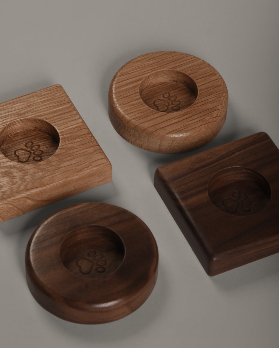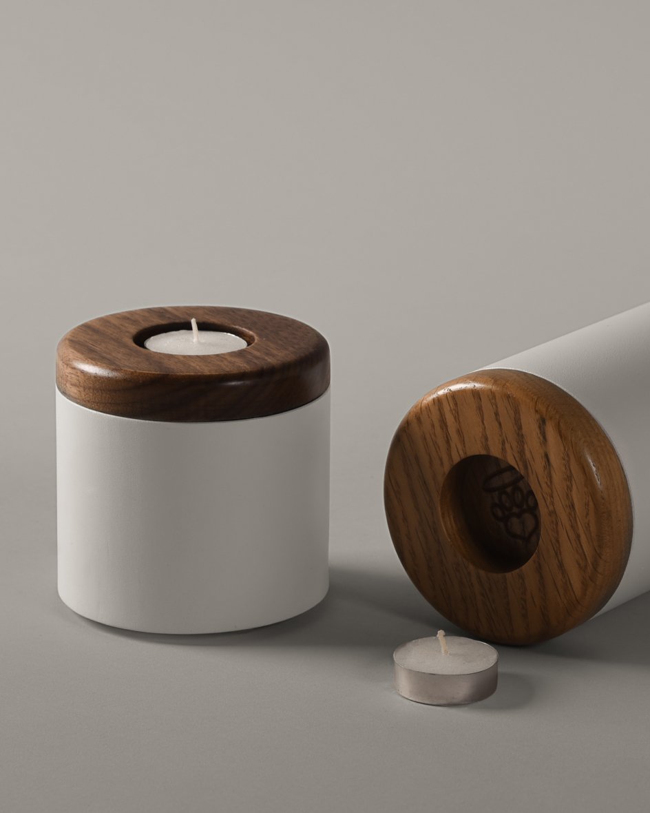 Esta urna es un concepto pensado para mantener viva la memoria de las mascotas. Incluyen una vela artificial y una natural, se puede grabar un logo en la parte cóncava de la tapa.