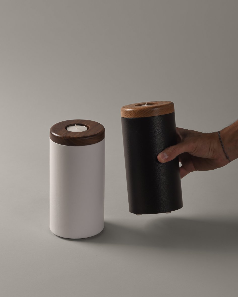 Esta urna es un concepto pensado para mantener viva la memoria de las mascotas. Incluyen una vela artificial y una natural, se puede grabar un logo en la parte cóncava de la tapa.