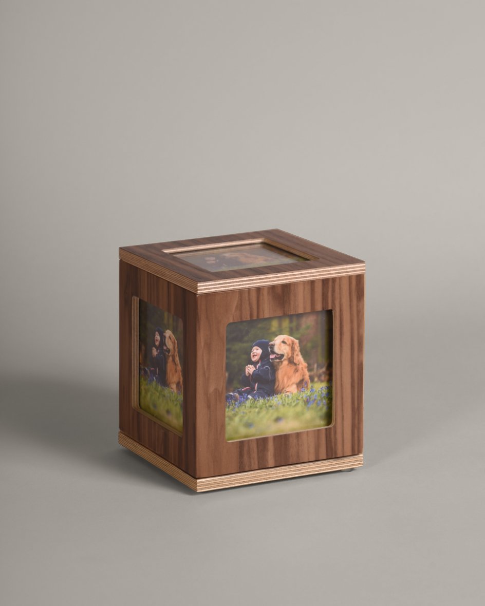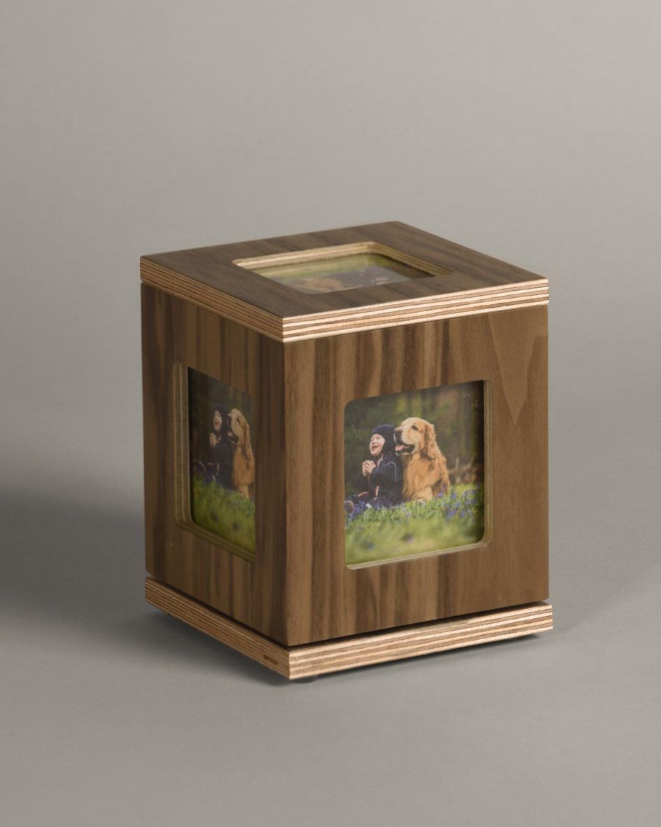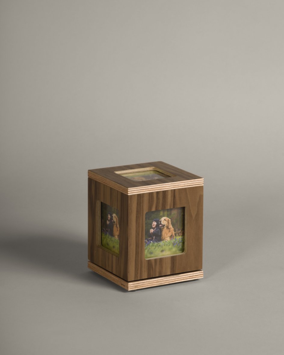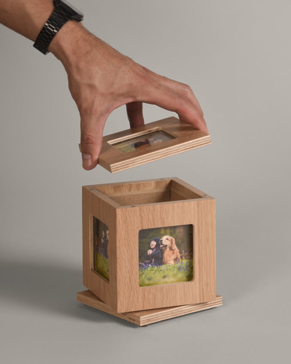 La urna Gallery cuenta con cinco espacios diseñados para exhibir las fotografías de tu mascota. Su base giratoria permite que puedas disfrutar de las imágenes desde diferentes ángulos. Además, el cierre de la tapa es con imanes, lo que facilita el cambio de fotos de manera rápida y sencilla.