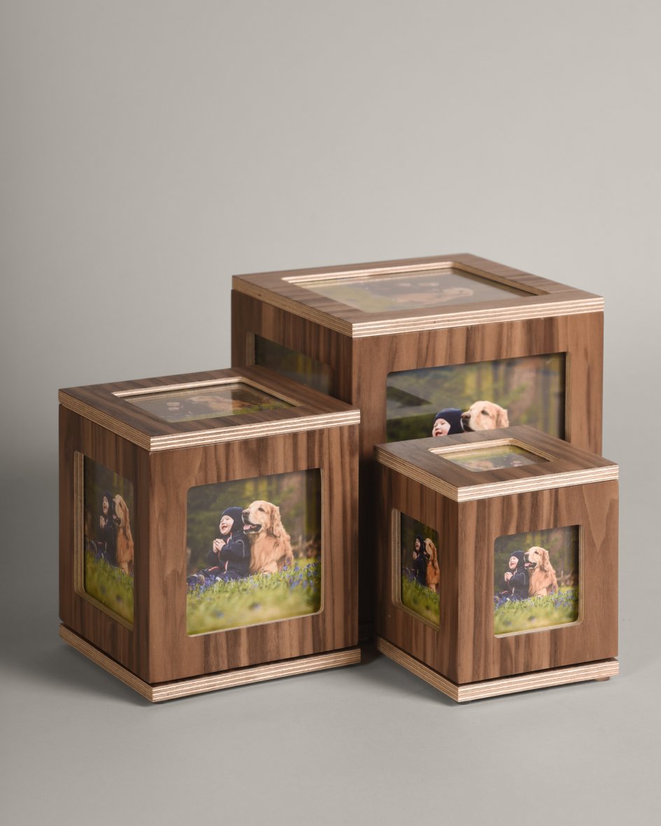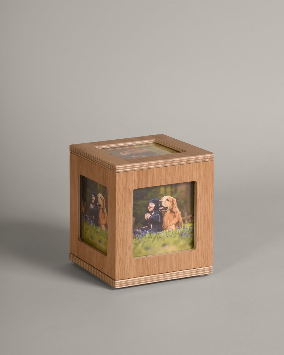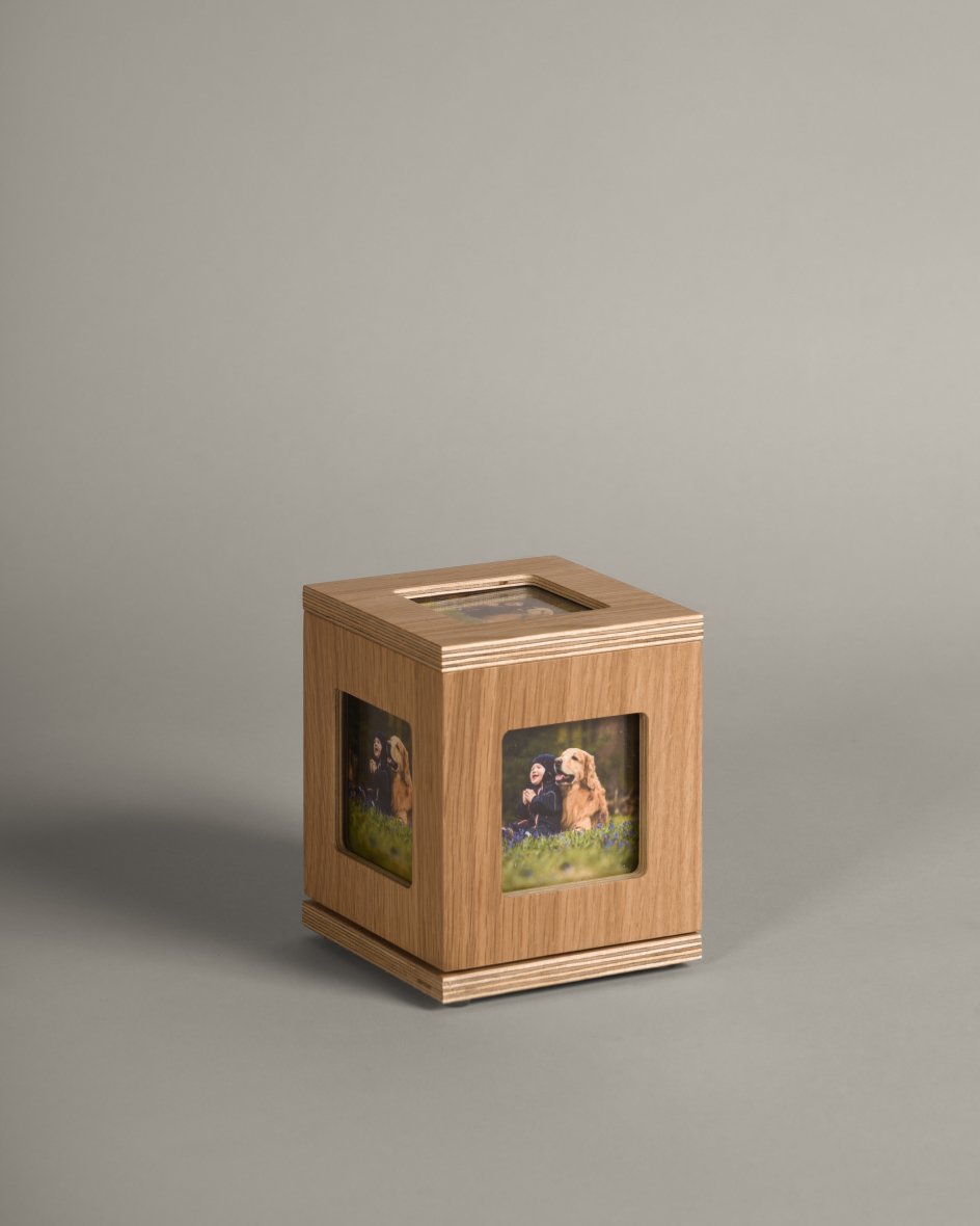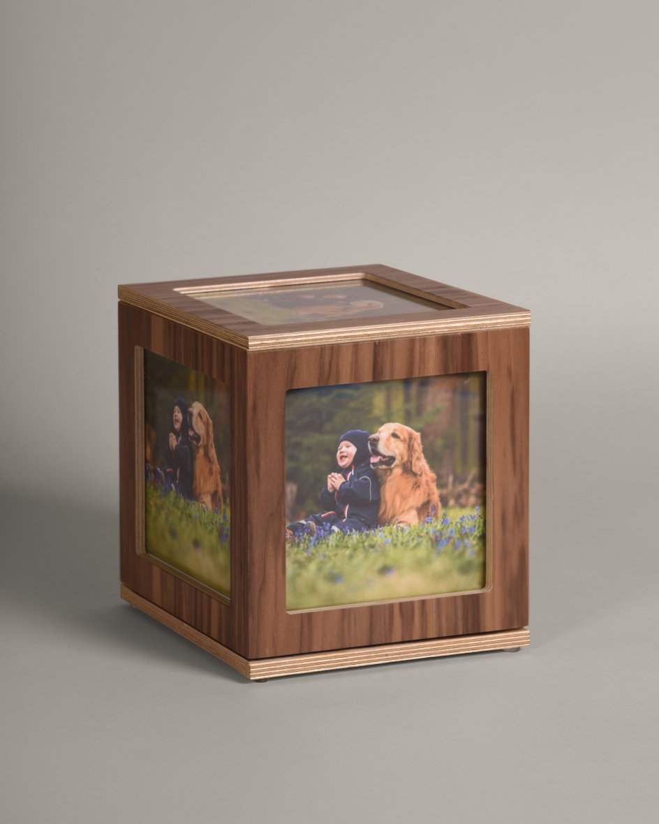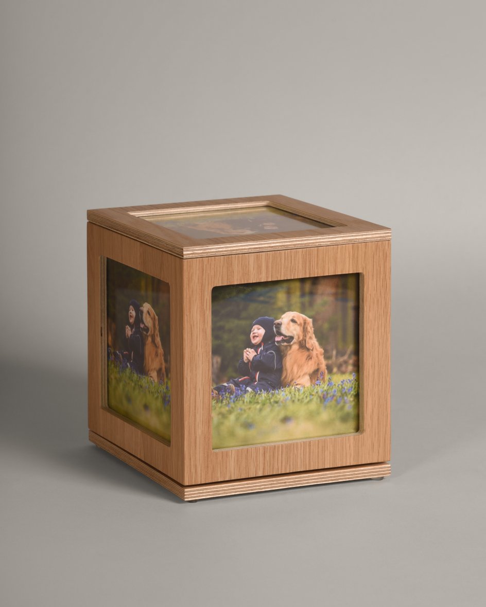 La urna Gallery cuenta con cinco espacios diseñados para exhibir las fotografías de tu mascota. Su base giratoria permite que puedas disfrutar de las imágenes desde diferentes ángulos. Además, el cierre de la tapa es con imanes, lo que facilita el cambio de fotos de manera rápida y sencilla.